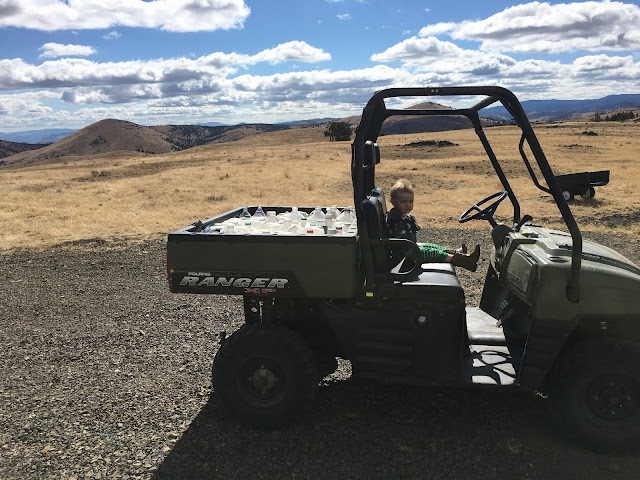 The next time Brent went out with only Emmett. He took the UTV and was watering some trees we hadn't gotten to the week before, when all of a sudden the base of the UTV apparently came off. He ended up putting Emmett on his shoulders and trekking it back to Jay's house. Thankfully Jay showed up and they were able to get the UTV. Now it is back in use and all fixed. Still, it is pretty hot out there and Emmett isn't very light. So Brent got a good work out that day.